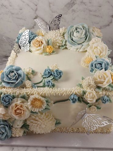 A beautifully decorated floral cake with butterflies.