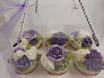 Four 530 (medium) sized floral cupcakes displayed in a deluxe box with handle. Just perfect for a special gift.