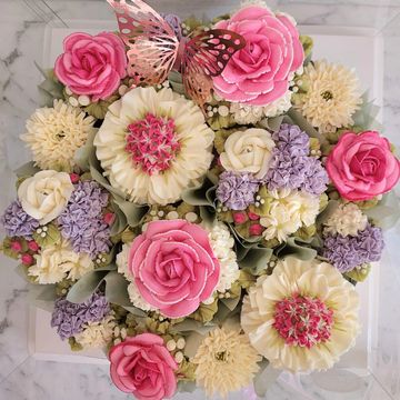 A fantastic way to arrive at your event or function, with a beautiful display of cupcakes already arranged and ready to place on the table. Platters are arranged with a mix of regular and mini cupcake sizes for your convenience. Available in a range of colours. Supplied on a cake board and in a display box, ready to slide out onto the table.